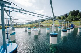 (eap) Germany’s Alpspitzbahn Nesselwang is expanding its summer tourism offering in the Bavarian Allgaeu region beyond classic hiking and cycling sports. The existing attractions “Alpspitzkick” (a mega zipline) and “Alpspitz Coaster” (a summer toboggan run) have recently been joined by the “Alpspitz Splash” – a floating ropes course of the “Aqua Chimp” brand (from the German company faszinatour). This was installed on the reservoir at the valley station of the mountain cableway to provide active climbing fun on the water for the whole family. The modular facility covers an area of 30 x 18 metres and consists of elements of varying difficulty, ensuring fun for both children and adults. The obstacles include a Ninja Line and a zipline, for example.