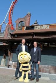 Freuen sich gemeinsam mit Biene Maja auf einen erfolgreichen Saisonstart mit neuer Görtz-Filiale: Parkmanager Bernd Beitz (li.) und Peter Görtz.